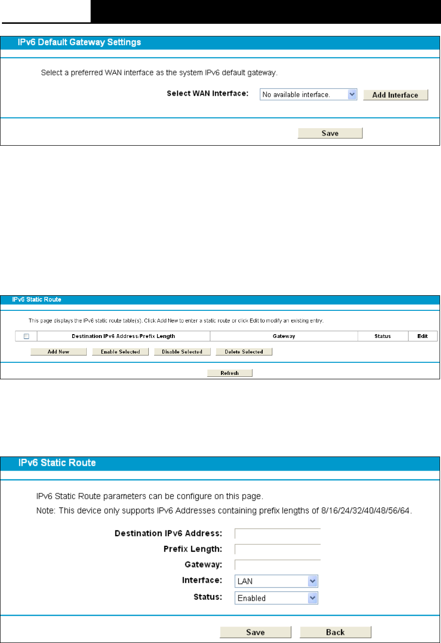 Choose “IPv6 Route Settings” “IPv6 Static Route”. You can see the IPv6 Static Route screen.