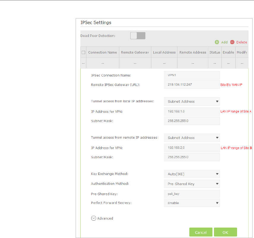 4 ) In the Remote IPSec Gateway (URL) column, Enter Site B’s