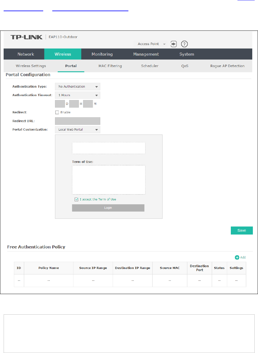 To apply Portal in a wireless network, please go to Wireless→Wireless Settings→SSIDs