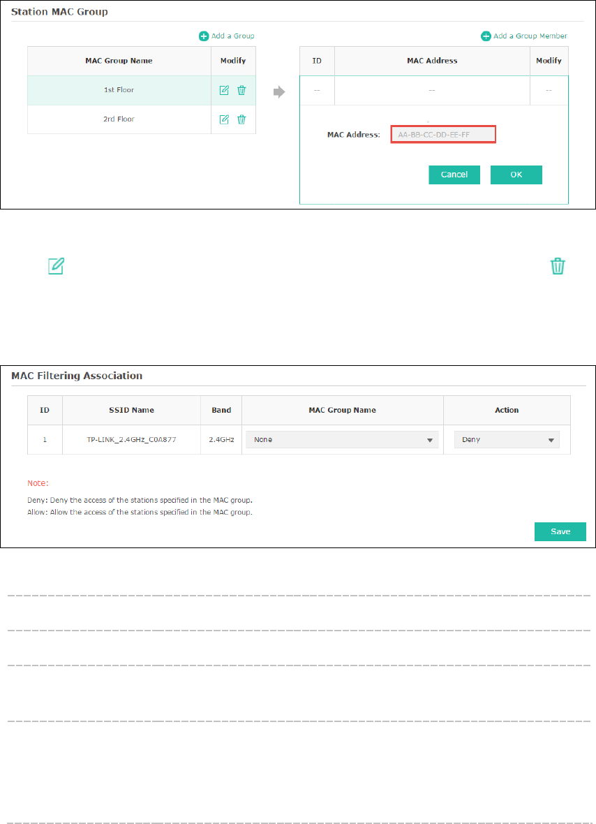 Click in Modify column to edit the MAC group name or MAC address. Click to
