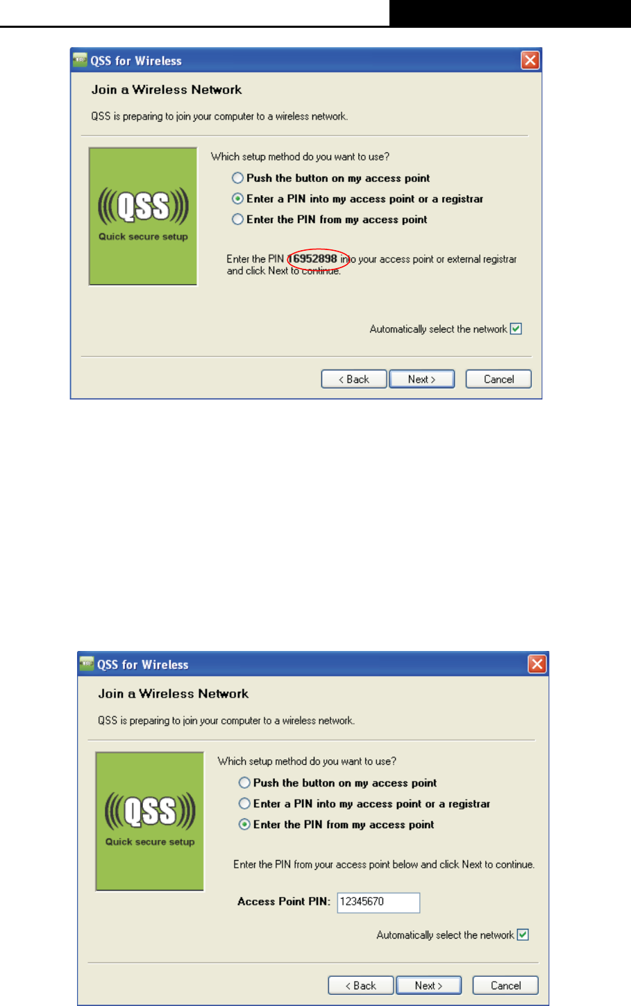 access point in the configuration utility of the QSS as below, and enter the PIN code of