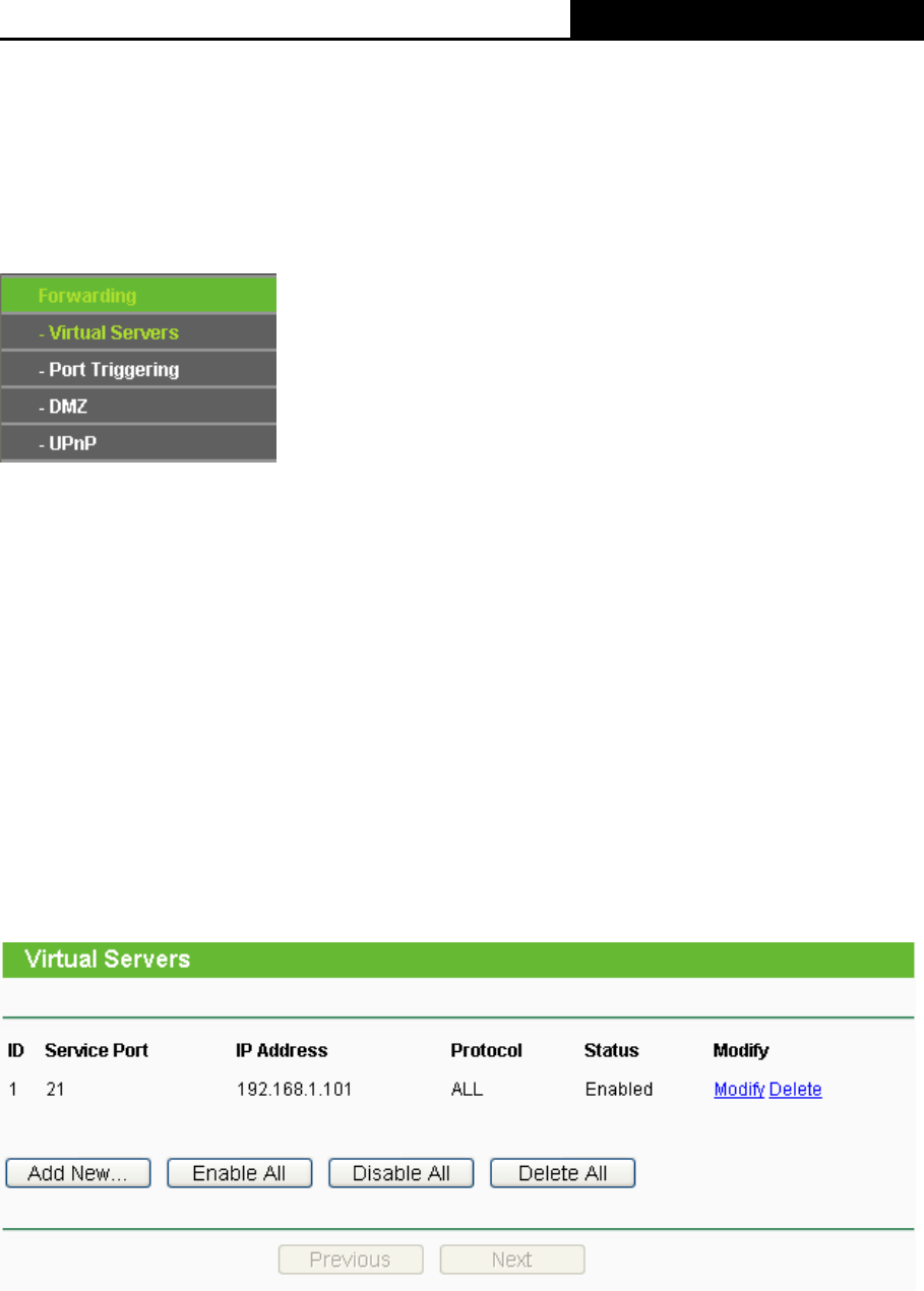 Choose menu “Forwarding→Virtual Servers”, you can view and add virtual servers in the