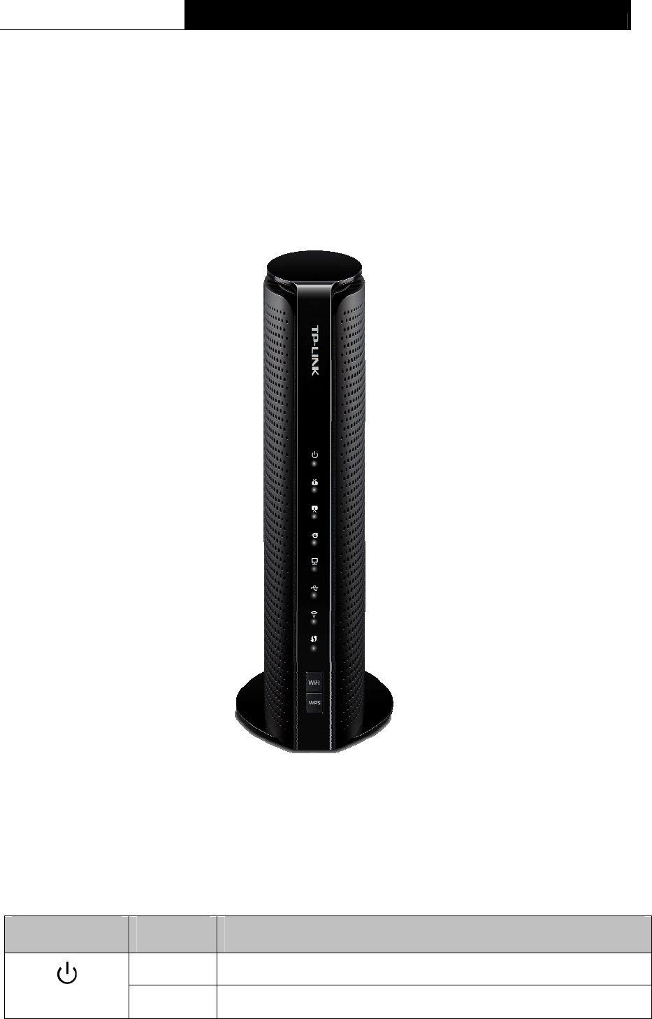 The modem router’s LEDs are located on the side panel (View from top to bottom). They indicate