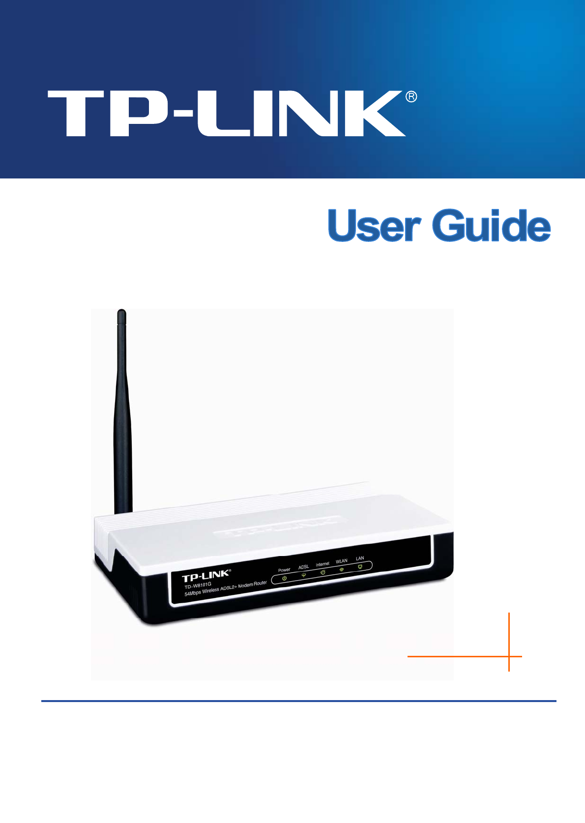 TD-W8101G 54Mbps Wireless ADSL2+ Modem Router User Guide Package Contents The following contents should be found in your package: ¾ One TD-W8101G 54Mbps Wireless ADSL2+ Modem Router ¾ One Power Adapter for TD-W8101G ADSL2+ Router ¾ Quick Installation Guide ¾ One RJ45 cable ¾ Two RJ11 cables ¾ One ADSL splitter ¾ One Resource CD , including: z This User Guide z Other Helpful Information ) Note: Make sure that the package contains the above items.