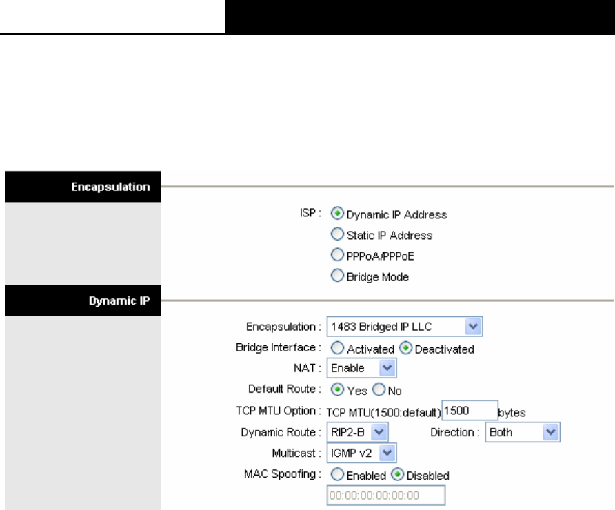 ¾ Encapsulation: Select the encapsulation mode for the Dynamic IP Address, you can leave it