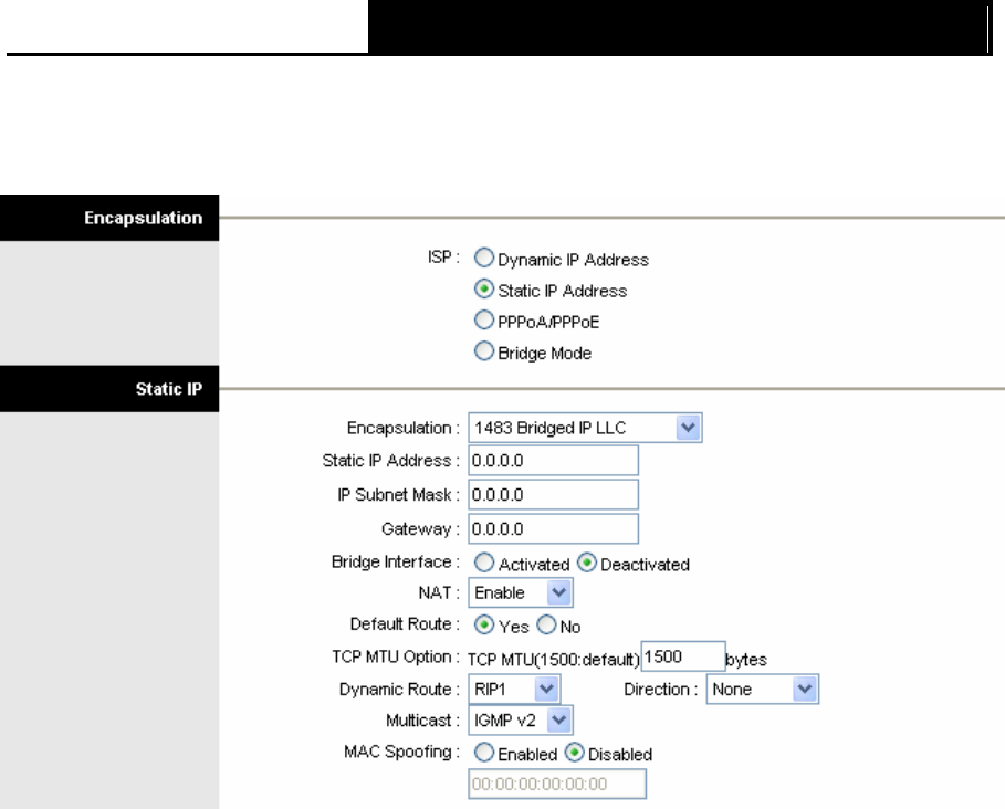 Select this option if your ISP provides static IP information to you. You should set static IP address,