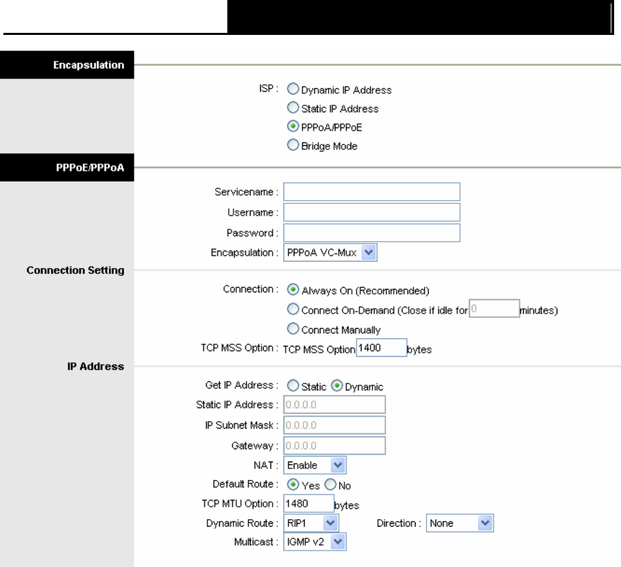 ¾ Encapsulation: For both PPPoE/PPPoA connection, you need to specify the type of