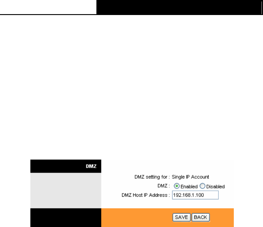 Choose “Advanced Setup→NAT→DMZ” in Figure 4-23, you can configure the DMZ host in the