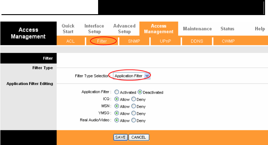 ¾ ICQ & MSN & YMSG & Real Audio/Video: Select Allow or Deny for these applications. If