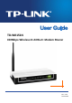TD-W8151N 150Mbps Wireless N ADSL2+ Modem Router User Guide Package Contents The following contents should be found in your package: ¾ One TD-W8151N 150Mbps Wireless N ADSL2+ Modem Router ¾ One Power Adapter for TD-W8151N ADSL2+ Router ¾ Quick Installation Guide ¾ One RJ45 cable ¾ Two RJ11 cables ¾ One ADSL splitter ¾ One Resource CD , including: z This User Guide z Other Helpful Information ) Note: Make sure that the package contains the above items.