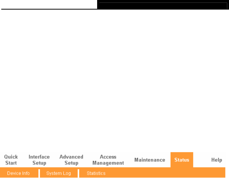 Choose “Status”, you can see the next submenus: Device Info, System Log and Statistics.