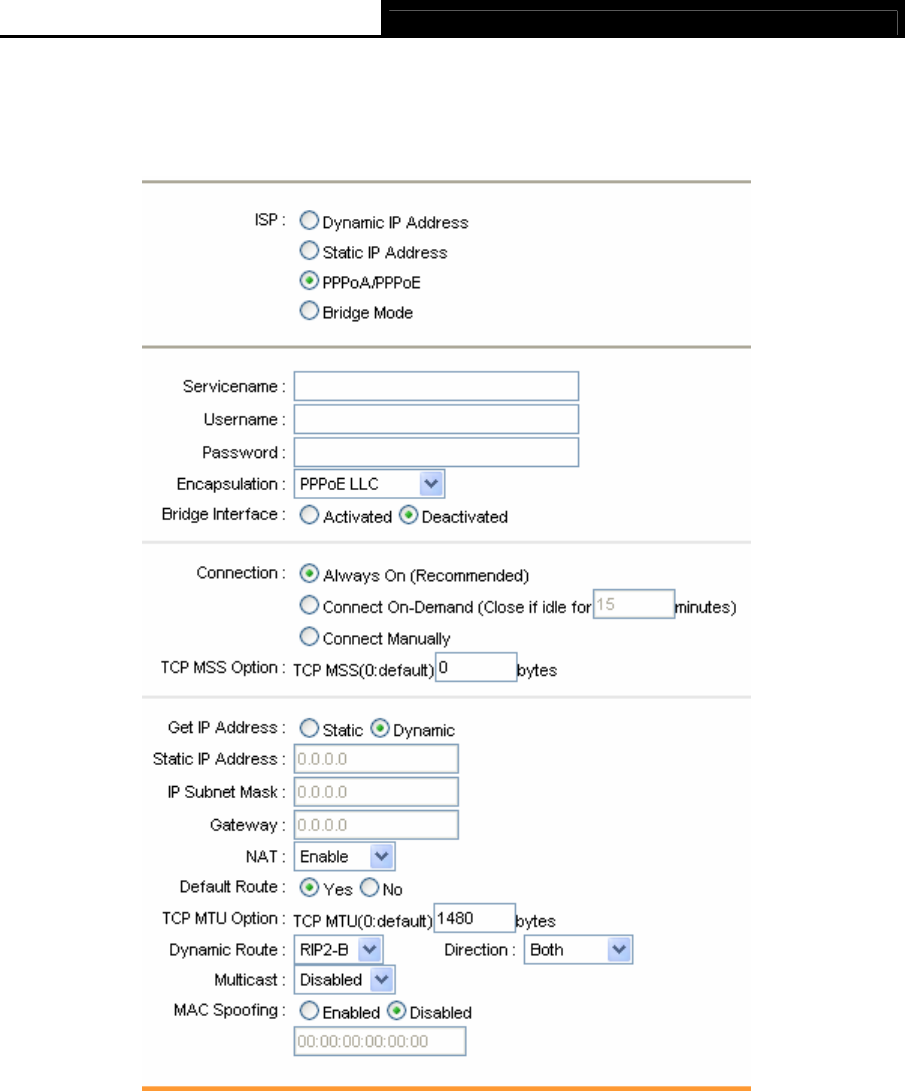 ¾ Encapsulation: For both PPPoE/PPPoA connection, you need to specify the type of