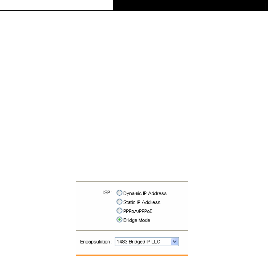 If you select this type of connection, the modem can be configured to act as a bridging device