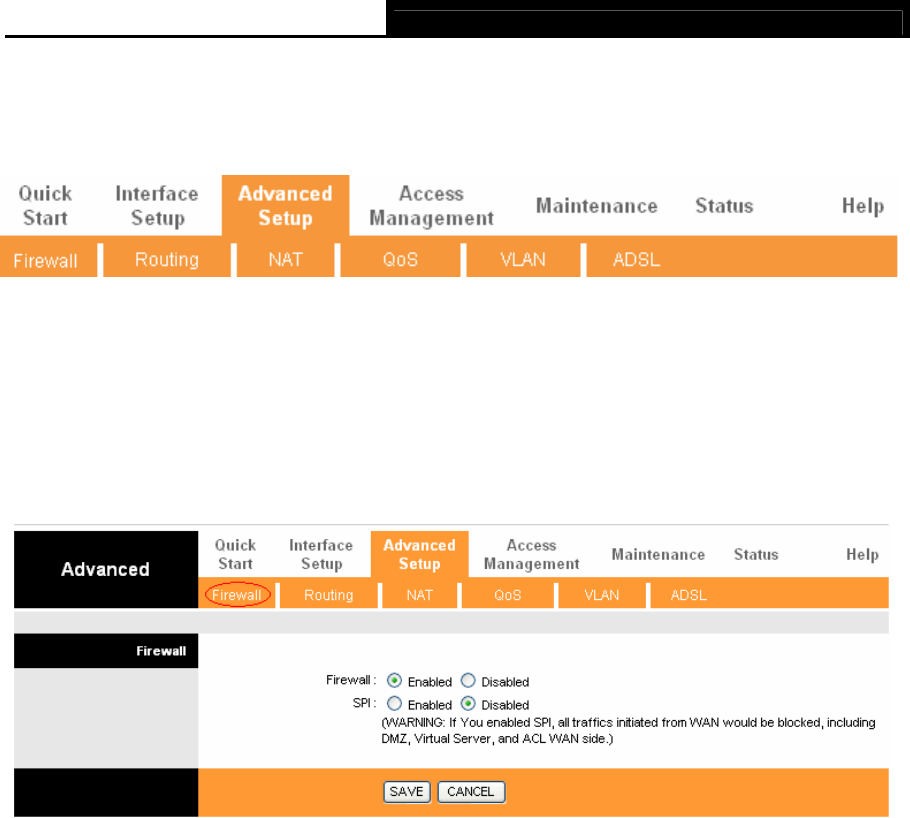 Choose “Advanced Setup→Firewall” menu, and you will see the next screen (shown in Figure