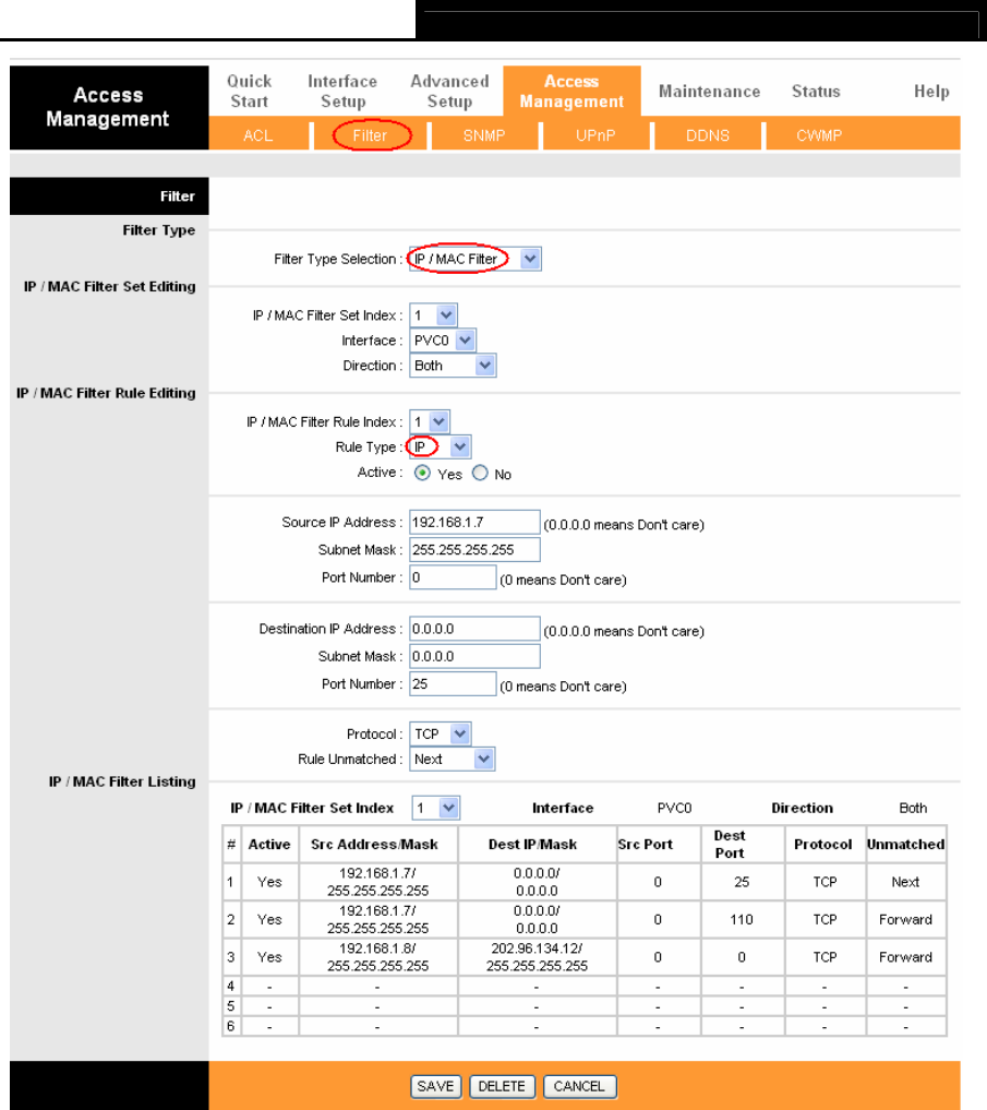 with six IP / MAC Filter Rule Indexes.