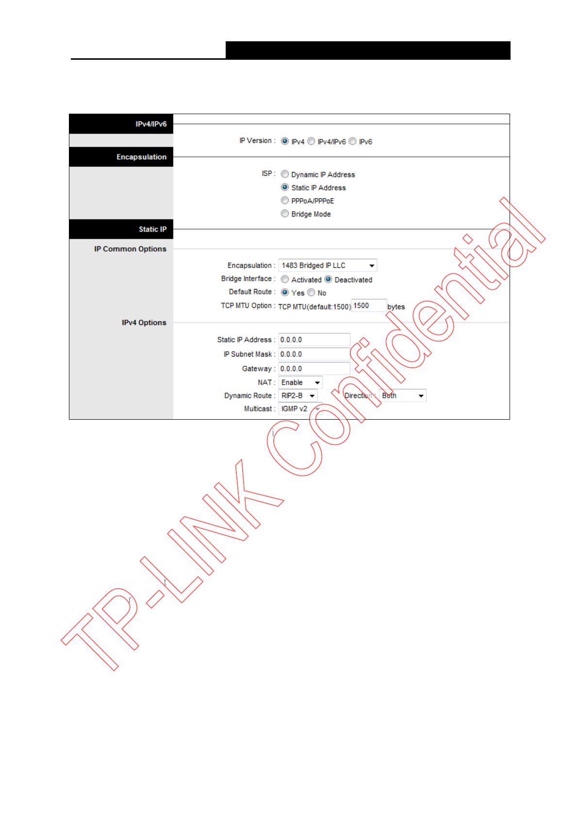 Select this option if your ISP provides static IP information for you. You should set static IP