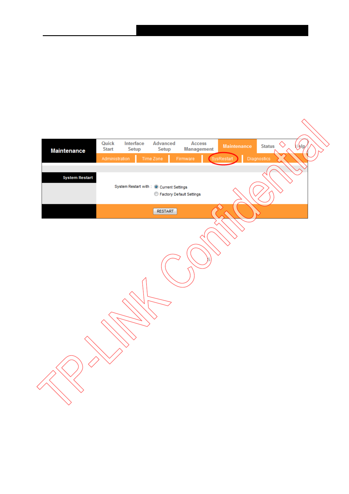 Choose “Maintenance→SysRestart”, you can select to restart the device with current settings or