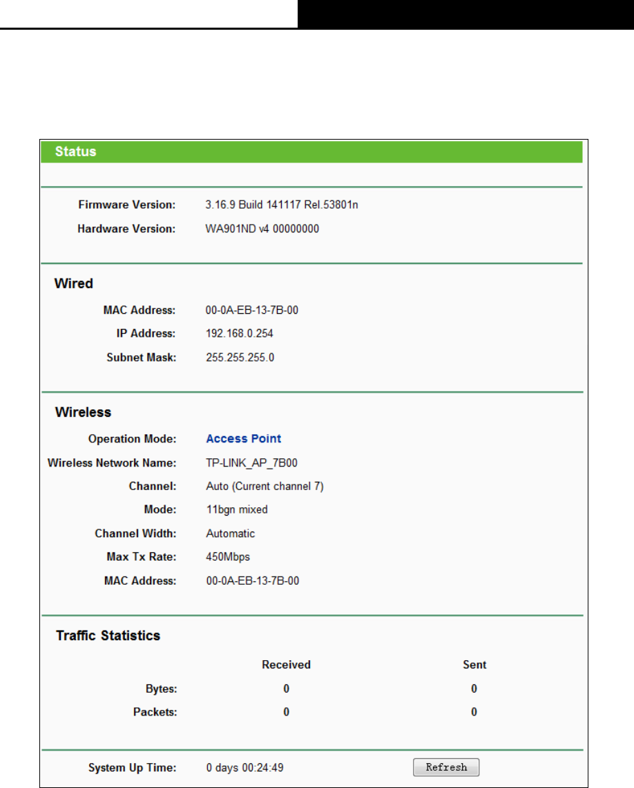 Selecting Status will enable you to view the AP’s current status and configuration, all of which is