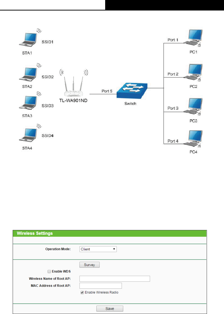 3) Client: This mode allows the device to act as a wireless station to enable wired host(s) to