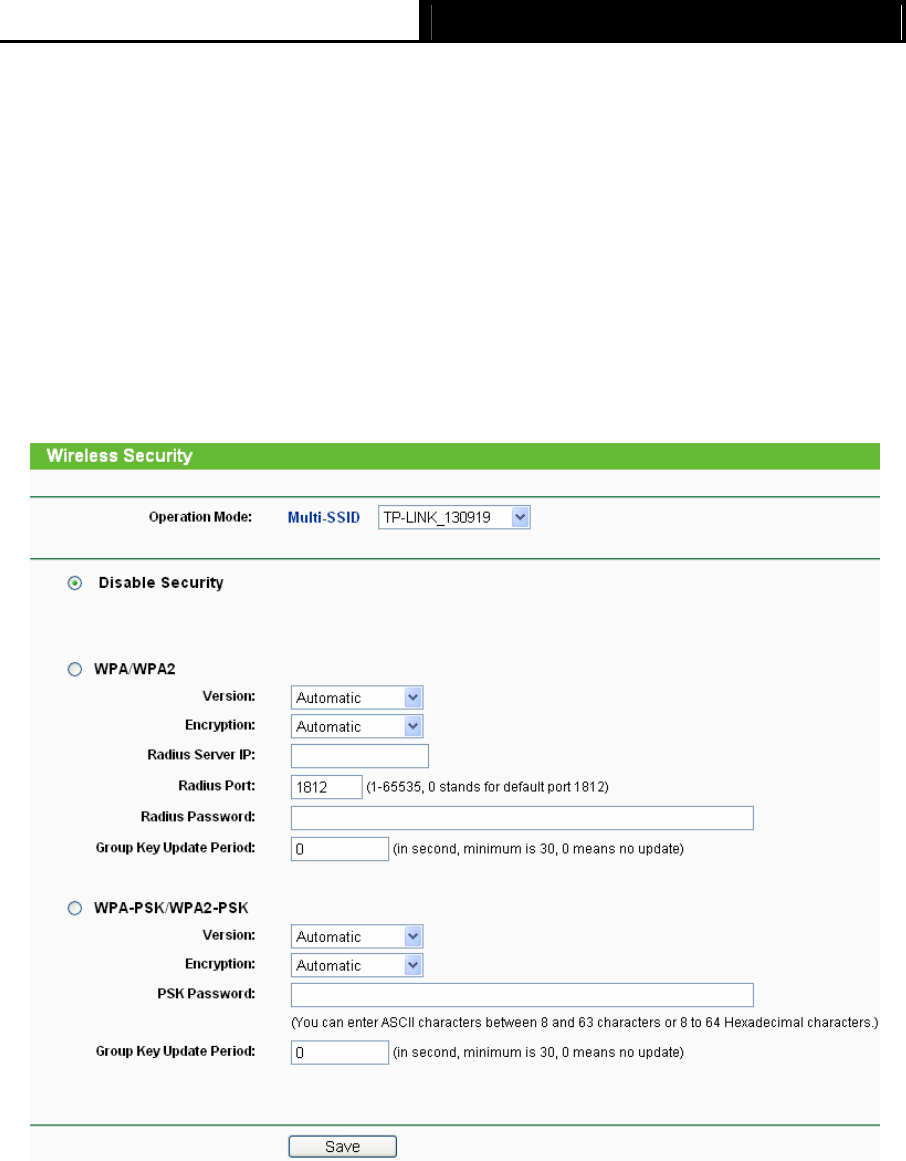 ¾ Disable Security - Check this box radio button to disable wireless security. If disabled, the