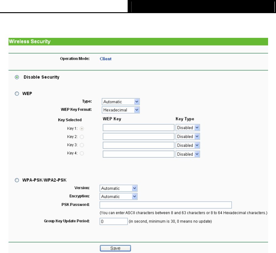 ¾ Disable Security - Check this box radio button to disable wireless security. If disabled, the