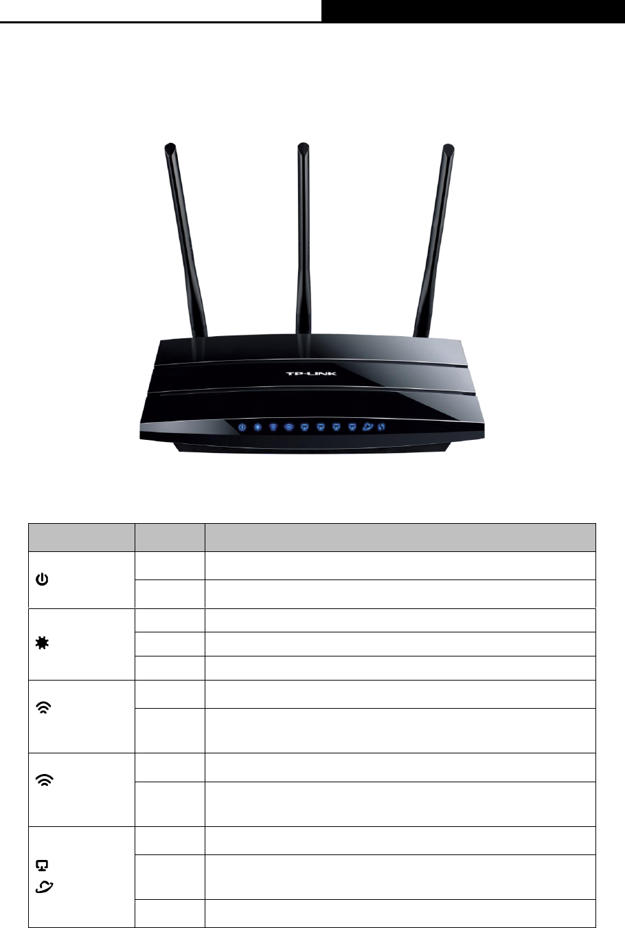 The Router’s LEDs are located on the front panel (View from left to right).