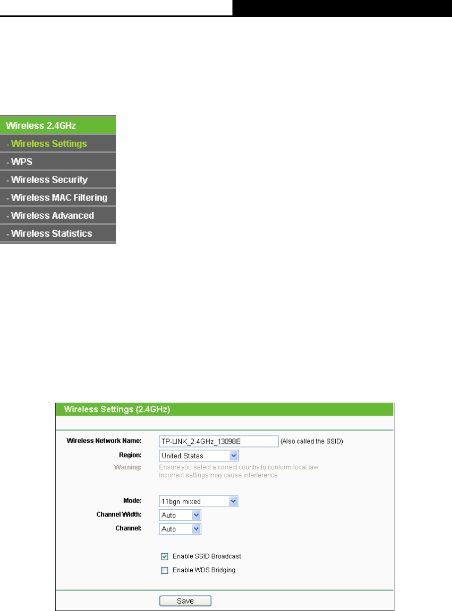 Choose menu “Wireless 2.4GHz → Wireless Settings”, you can configure the basic settings for