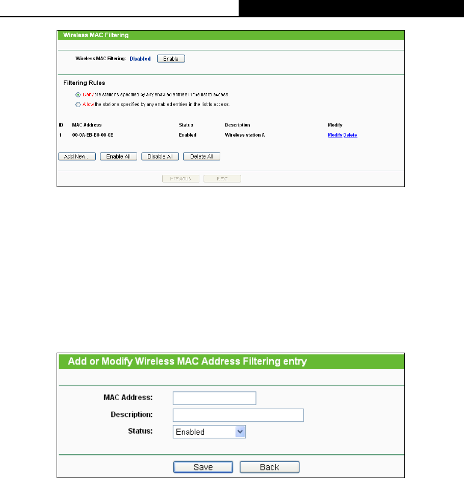 Wireless MAC Address Filtering entry" page will appear, shown in Figure 4-25: