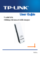 TL-WN727N 150Mbps Wireless N USB Adapter Package Contents Please verify that all the package contents below are available. ¾ ¾ ¾ ¾ One TL-WN727N 150Mbps Wireless N USB Adapter Quick Installation Guide One USB cable One Resource CD for TL-WN727N, including: • • • TP-LINK Wireless Configuration Utility (TWCU) and Drivers User Guide Other helpful information Make sure that the above items are contained in the package. If any of the above items are damaged or missing, please contact your distributor.