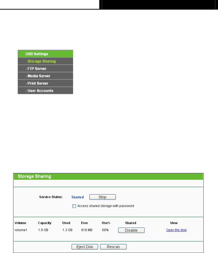 There are four submenus under the USB Settings menu (shown in Figure 4-33), Storage Sharing,