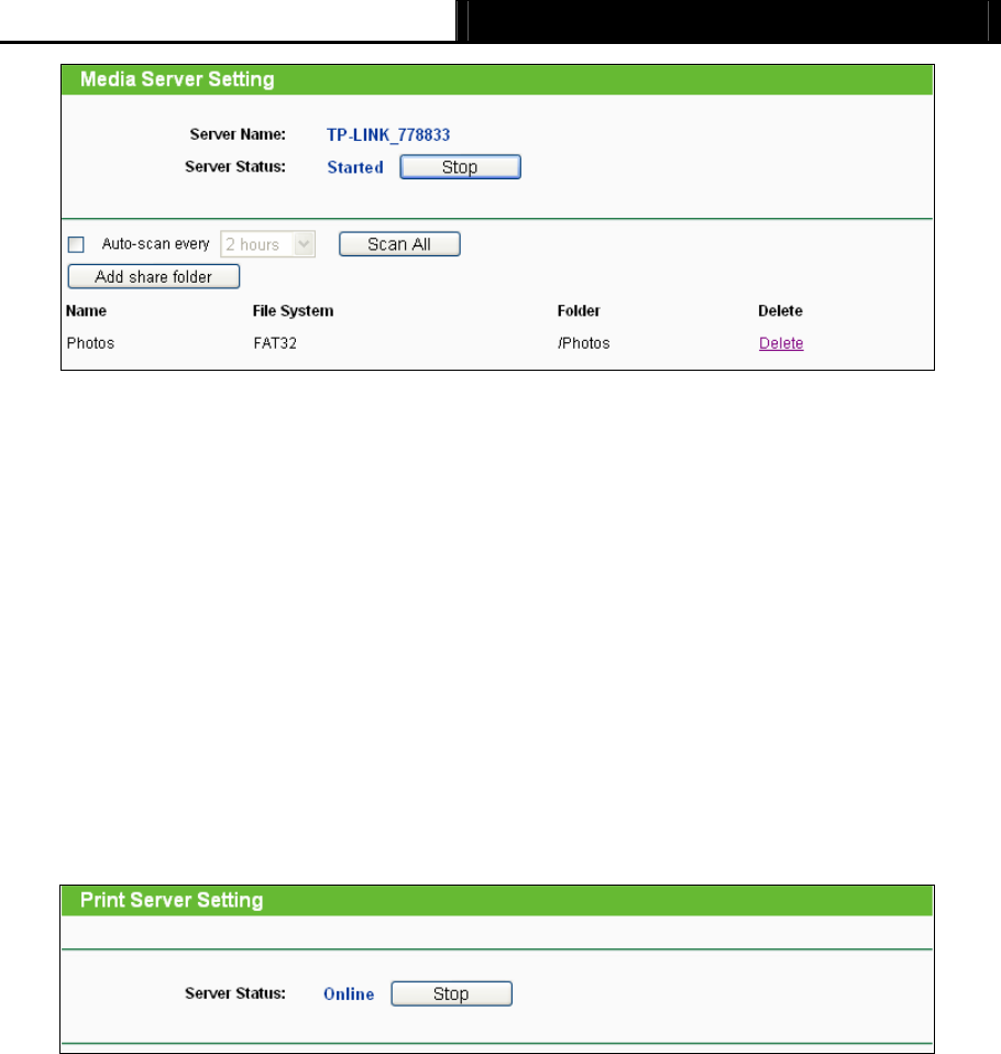 Choose menu “USB Settings→Print Server”, you can configure print server on this page as