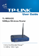 TL-WR542G 54M Wireless Router User Guide Package contents The following contents should be found in your box: ¾ ¾ ¾ ¾ ¾ One TL-WR542G 54Mbps Wireless Router One AC power Adapter for TL-WR542G 54Mbps Wireless Router Quick Installation Guide One Resource CD for TL-WR542G 54Mbps Wireless Router, including: • This Guide • Other Helpful Information Wall-mounting screws Note: If any of the listed contents are damaged or missing, please contact the retailer from whom you purchased the TL-WR542G 54Mbps Wireless
