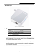 TL-WR700N 150Mbps Wireless N Mini Pocket Router 1.4 Panel Layout Figure 1-1 TL-WR700N sketch ¾ LED Status On Flashing Off Indication The system is working properly. The LAN/WAN cable is connected. The system is working improperly, please check the device connection. Table 1-1 The LED Description ¾ LAN/WAN: This LAN/WAN port works as LAN in AP/Repeater/ Bridge/Client mode and as WAN in Router mode.