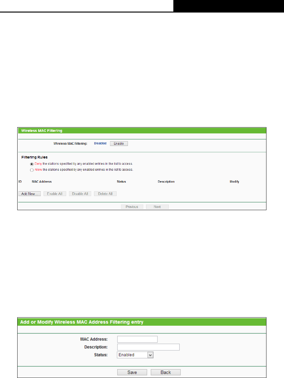Wireless MAC Address Filtering entry" page will appear, shown in Figure 4-21: