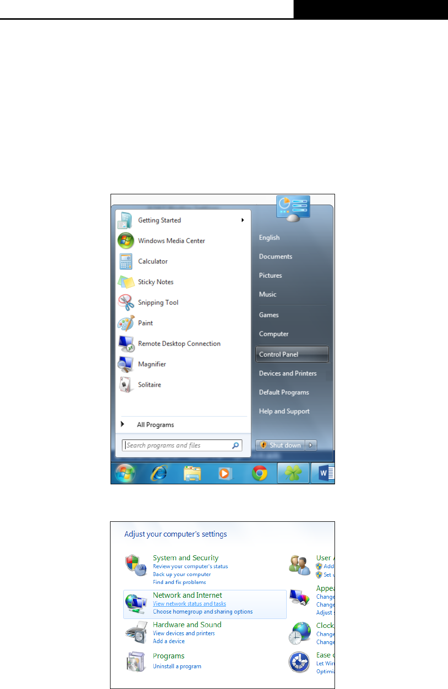 2) Click on View network status and tasks under Network and Internet.