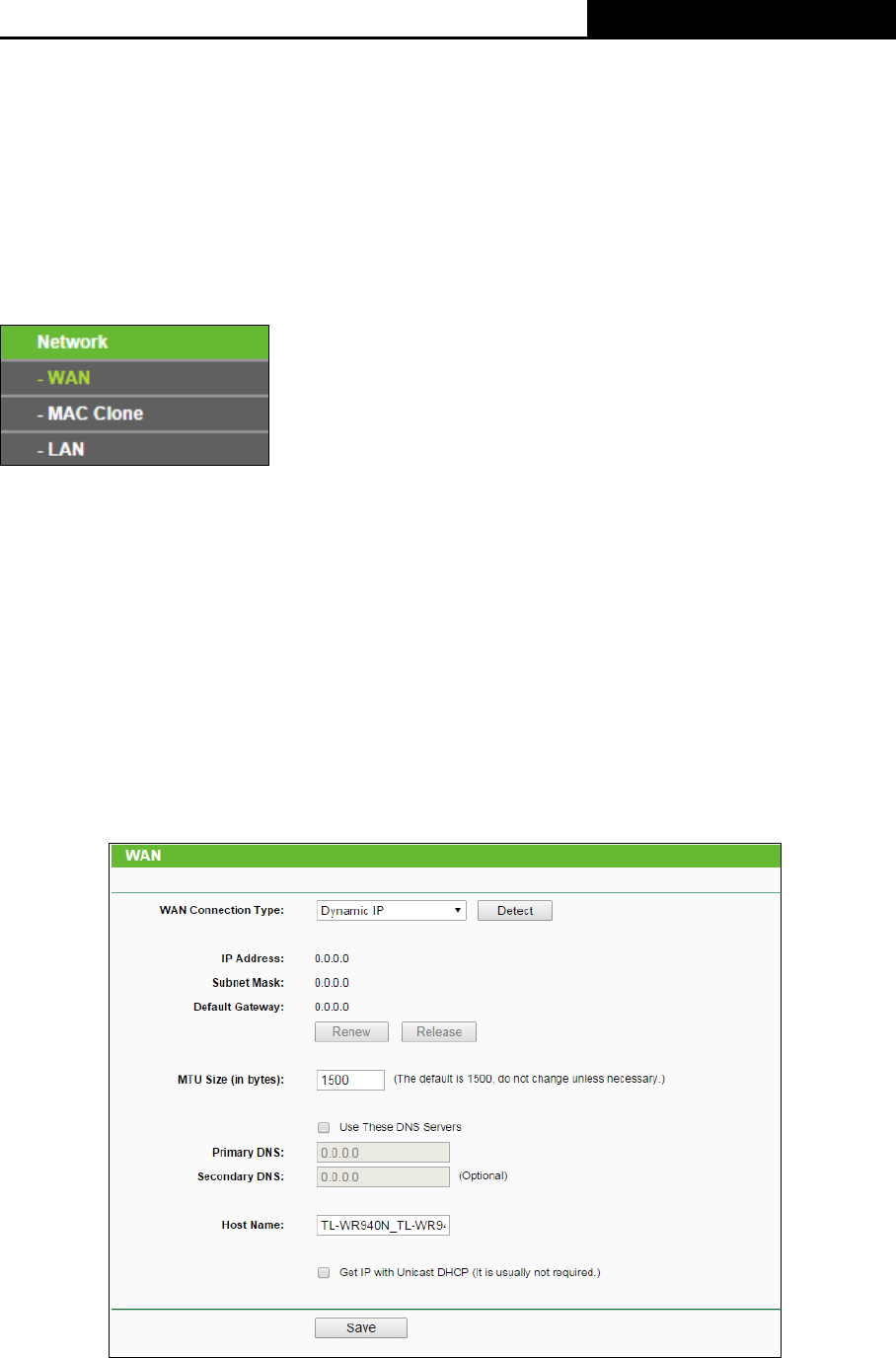 There are three submenus under the Network menu (shown in Figure 4-6): WAN, MAC Clone and