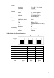 Video Input Level Impedance Pre-Emphasis 1V p-p ± 0.15 V p-p Load 75 ohms NTSC & PAL Sensor Image area Array size 1/3” CMOS Sensor 5.961mm*4.276mm 510 X 496 (NTSC) 628 X 586 (PAL) Night Vision Range 10 m LENS LENS focus View angle f6.0mm, F2.0 , (4 glasses with IR cut filter) Fixed 60° Adaptor Bracket DC 12V/300mA Optional Image Illumination LENS Accessory 3.