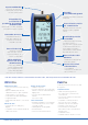 Soporte multimedia Puertos RJ-45, RJ-11/RJ-12 y coaxiales para verificar cables Pantalla retroiluminada grande de cobre de baja tensión Resultados instantáneos fáciles de interpretar Comprobación y resolución de problemas de longitud mediante TDR Detección del servicio de comunicación Identifica fallos en cables, eliminando Identifica servicios de telefonía así dudas innecesarias conjeturas analógicos (PBX) y digitales (ISDN) Generador de tonos Prueba de potencia extendida Capacidad de identific