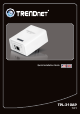 200Mbps Powerline AV Wireless N Access Point (TPL-310AP) Media Server Y X B A Game Console Wireless N USB Adapter (TEW-624UB) Wireless N 4-Port Media Bridge (TEW-640MB) Router Powerline AV Adapter (TPL-303E) Powerline AV Adapter (TPL-303E) Internet Wireless 300Mbps Powerline 10/100Mbps The installation diagram shows a typical setup of the TPL-310AP extending your wireless network connectivity to another room when bridged with an additional powerline adapter, in this case, the TRENDnet TPL-303E.