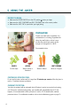 8. USEFUL TIPS PRECAUTION REASON Squeaking sounds are normal. It’s from friction as the pulp rubs against the moving parts of the juicer. Do not use ice or frozen fruit. Ice is too hard to be squeezed and can damage the juicing parts. Do not use hard or dried food. Certain hard or dried foods, like almonds, can damage the juicing parts. Cut fibrous produce into 1-2 inch pieces. Long and stringy fibers can wrap around the AUGER and cause the juicer to stall or damage the juicing parts.