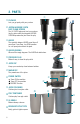 2. TEILE 1 1 STÖSSEL Setzt Obst und Gemüse unter Druck. 2 ENTSAFTEREINHEIT MIT LEICHT ZU REINIGENDEM ABSCHEIDER 2 Der XL-EINFÜLLSCHACHT füttert den Entsafter mit Zutaten, während der integrierte SAFTABSCHEIDER den Saft vom Trester trennt. 3 PRESSSCHNECKE Die speziell konzipierte PRESSSCHNECKE nimmt den Mund nicht zu voll. Die niedrige Drehzahl sorgt für kaltgepressten Saft ohne Matsch. 11 4 PRESSSCHNECKENGEHÄUSE Wo das Wunder passiert. Hier befindet sich die PRESSSCHNECKE.