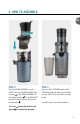 4. HOW TO ASSEMBLE EN STEP 3: STEP 4: Place the JUICING ASSEMBLY over the AUGER and into the AUGER HOUSING. Align the arrow on the JUICING ASSEMBLY to the unlocked position on the MAIN BODY and twist it clockwise until it clicks into the locked position . Place the JUICE CONTAINER and the PULP CONTAINER under the relevant outlets. Make sure the JUICE CAP is open before you begin juicing. Your Shine Juicer is now fully assembled. The arrow should align with the lock symbol to complete the assembly.