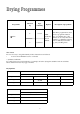 Drying Programmes Programme Max load kg Type of laundry 6 Cotton Options Textile • Synthetics • Cotton Delicate Time 3 Synthetics Description of programme If the Time programme has been selected, programme duration time of 15 minutes up to 150 minutes can be set by intervals of 5 minutes or 10 minutes. Drying thick or multi-layered textiles, e.g. terry towelling items.