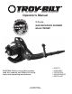 TABLE OF CONTENTS Warranty Page Safety Rules 2 Operation Page 12 Pages 3 - 7 Maintenance Pages 13 - 15 Oil and Fuel information Page 8 Troubleshooting Page 16 Assembly Page 9 Specifications Page 17 Starting / Stopping instrustion Pages 10 - 11 Parts List Page 18 WARRANTY STATEMENT TWO YEAR LIMITED WARRANTY ON TROY BILT GAS BACKPACK BLOWER For two years from the date of purchase, when this Blower is used and maintained according to the operator’s manual, Troy Bilt will repair any de
