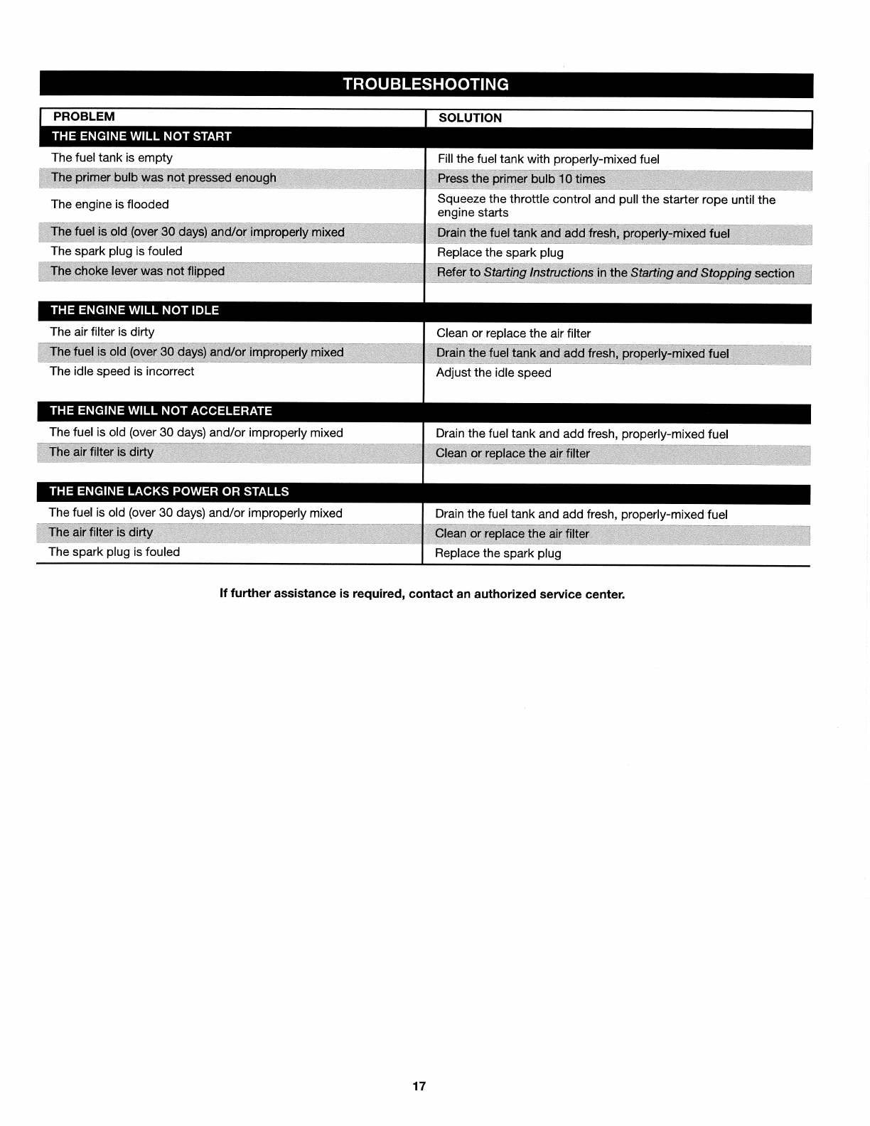 (SN =iR=] felons i el PROBLEM SOLUTION o The fuel tank is empty Fill the fuel tank with properly-mixed fusee Squeeze the throttle control and pull the starter rope until the The engine is flooded engine starts The spark plug is fouled Replace the spark plug The air filter is dirty Clean of replace the alr fitter Theistic oid fiver 50 Gy andiron impropriety miked = The idle speed is incomes Adjust the die speed The fuel is old (over 30 days) and/or improperly mixed Drain the fuse tank and add fresh, properly