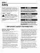 Safety (continued) • Add fuel in a clean, well-ventilated area outdoors where there are no sparks or flames. Slowly remove the fuel cap only after stopping engine. Do not smoke while fueling or mixing fuel. Wipe up any spilled fuel from the unit immediately. • Avoid creating a source of ignition for spilled fuel. Do not start the engine until fuel vapors dissipate. • Move the unit at least 30 feet (9.1 m) from the fueling source and site before starting the engine.