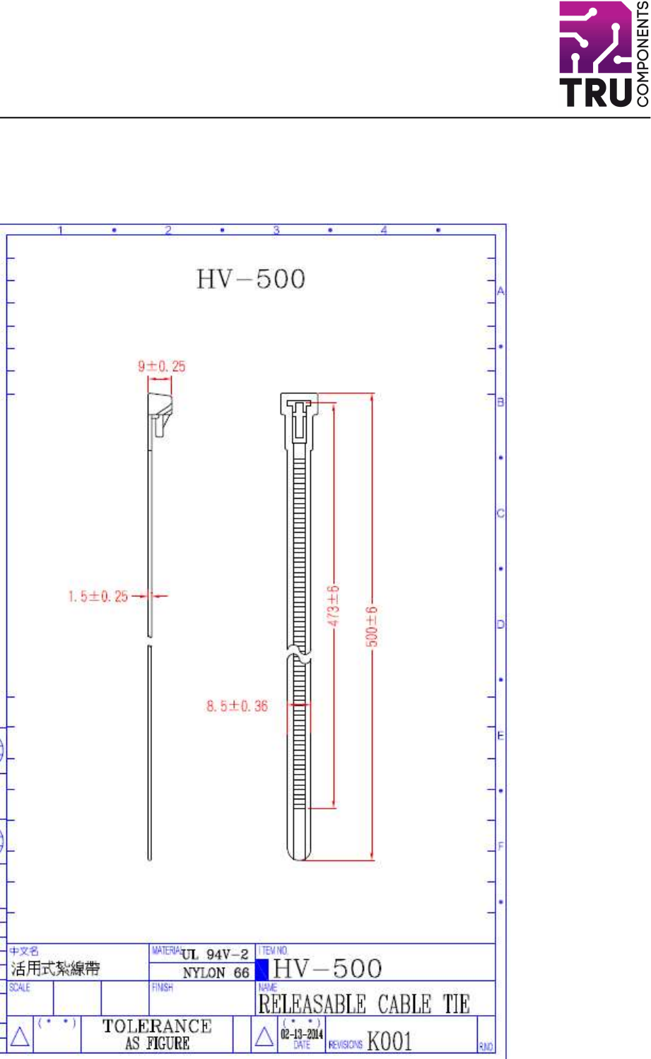 Conrad Electronic SE, Klaus-Conrad-Str. 1, D-92240 Hirschau Item no.: 1592884 Data Sheet RELEASABLE CABLE TIE Length: 500, Width :8.5mm. Max. bundle dia. 145mm.