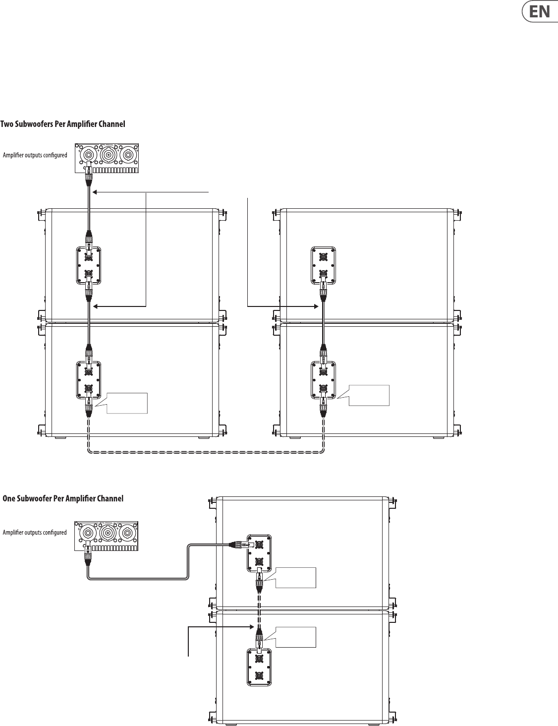 To power one subwoofer per amplier channel, a single NL4 cable from LAB GRUPPEN bi-wired NL4 outputs (Channel 1 = 1+/-; Channel 2 = 2+/-) connects to the rst