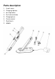 Parts description 1, On/off switch 2, Charging indicator 3, dust cup button 4, Dust release button 5, Charging base 6, Crevice nozzel 7, Small brush 8, adaptor
