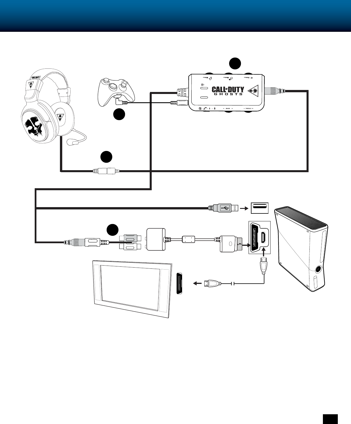 Cable for audio output when used with an HDMI connection (available from turtlebeach.com). Note: Note: If your HDMI TV has red/